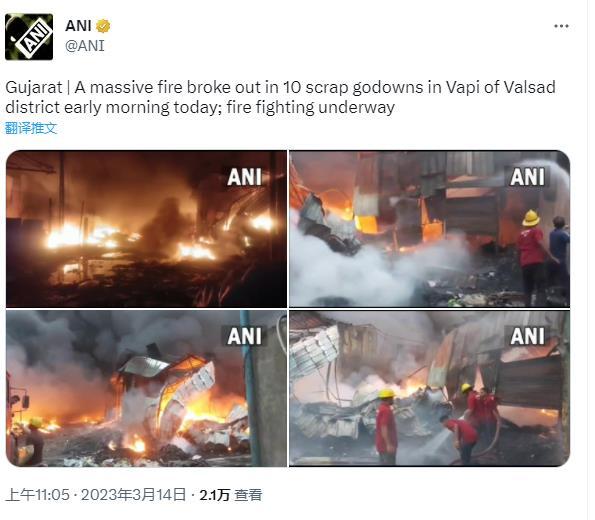 中新网3月14日电 据印度ANI通讯社报道,当地时间14日凌晨,印度古吉拉特邦瓦尔萨德地区的废品仓库发生大火。