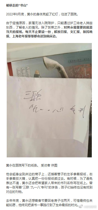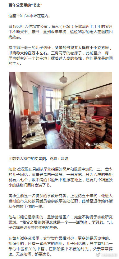 据悉,书的主人黄永生前是一名资深的宗教研究者。上世纪五十年代,他进入当时的市文化教育委员会宗教事务处任职,此后至退休始终活跃在宗教工作的一线。当老人的儿女听说有人误以为他们将父亲的藏书当垃圾废品卖掉,也有些慌张和不忿。“我们都知道老爷子喜欢书,肯定是尊重他,尽全力去对他好。他留下来的这些书都很珍贵,我们不可能说当成垃圾卖给收废品的。这样太糟蹋了,也对不起老爷子,这是一定不会乱来的。”儿媳妇说。(上观新闻)