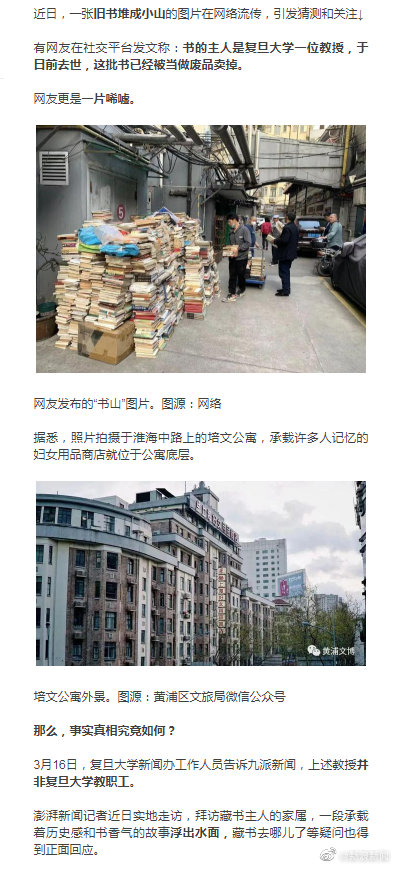 【#家属辟谣老人一屋藏书被当成废品卖# 真相来了→】近日,一张旧书堆成小山的图片在网络流传,引发猜测和关注。有网友在社交平台发文称:书的主人是复旦大学一位教授,于日前去世,这批书已经被当做废品卖掉。网友更是一片唏嘘。3月16日,复旦大学新闻办工作人员告诉记者,上述教授并非复旦大学教职工。记者近日实地走访,拜访藏书主人的家属,一段承载着历史感和书香气的故事浮出水面,藏书去哪儿了等疑问也得到正面回应。