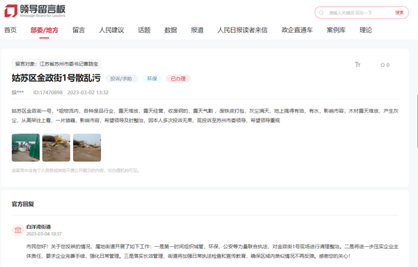 “从一旁的高架上往下看,狼藉一片,非常影响市容。”3月2日,江苏苏州群众姜先生在人民网“领导留言板”上反映,当地金政街1号“废钢、木柴、岩棉板等废旧材料随处堆放,地面油污不堪,灰尘满天”。两天后,姑苏区白洋湾街道回复表示,已第一时间组织对现场进行清理整治。