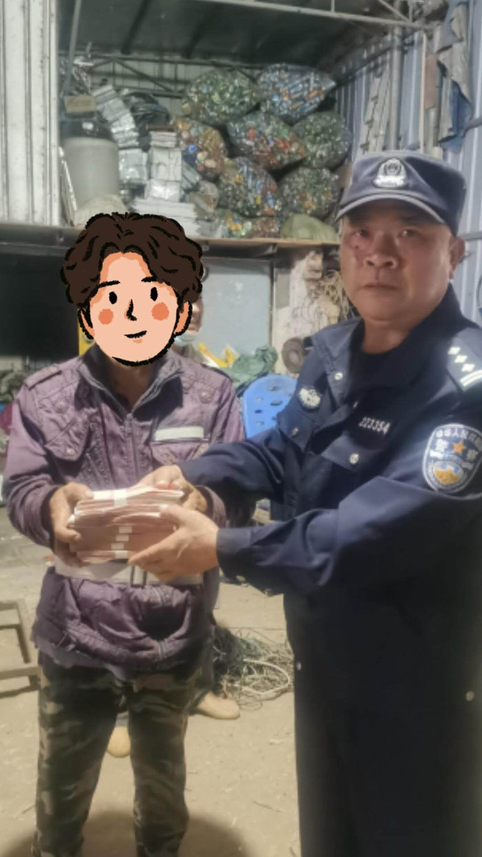 当事人7万现金失而复得接报后,值班民警廖东方带领辅警王亚生、陈水军火速赶到现场。了解情况后,民辅警一边安抚张先生夫妇焦急的情绪,一边兵分两路展开追查:一路调取沿途监控,排查废品回收车辆轨迹;另一路走访周边村民,搜集回收人员线索。凭借模糊的体貌特征和交通工具描述,民警仅用半小时就锁定了回收员汤先生,并获取其联系方式。