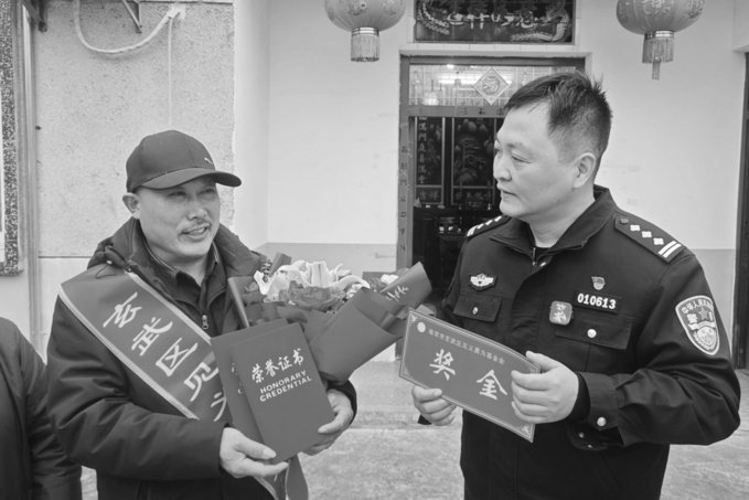 2月9日12时,记者随送奖团队从南京市公安局玄武分局梅园新村派出所出发,一同驱车前往安徽六安,共同见证这场跨越省界的暖心奖励。16时15分,周师傅老家的村落渐渐进入视野。询问两户人家后,车子拐入一条窄窄的村道。离周师傅家尚有200米左右,他的爱人已早早守在路口,向着来车方向不住地张望。16时30分,车辆来到周师傅家门口,送奖团队刚下车,周师傅与当地村干部便快步迎了上来。眼前的周师傅换上了一身整洁的新衣,褪去平日干活穿的旧棉袄,显得精神而庄重。众人刚踏进院门,院外骤然响起鞭炮声,原来当地村民以最朴实的方式欢迎来自南京的客人。
